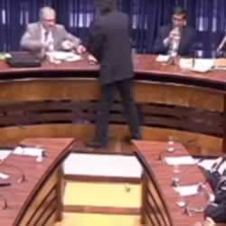 Carlos Giannazi (PSOL) colocou vestígios de bombas e balas sobre a mesa durante comissão na Assembleia, nesta quarta (9). Marco Antônio Zago atirou material no chão.